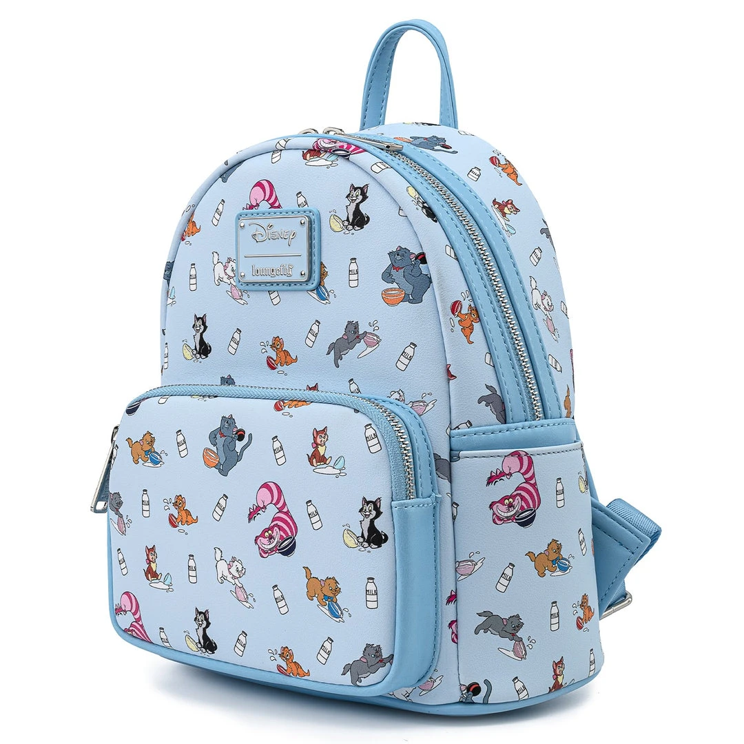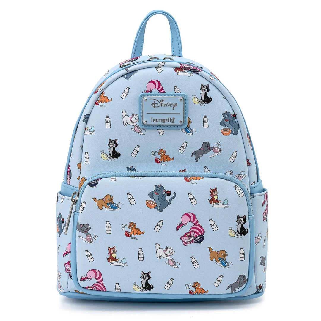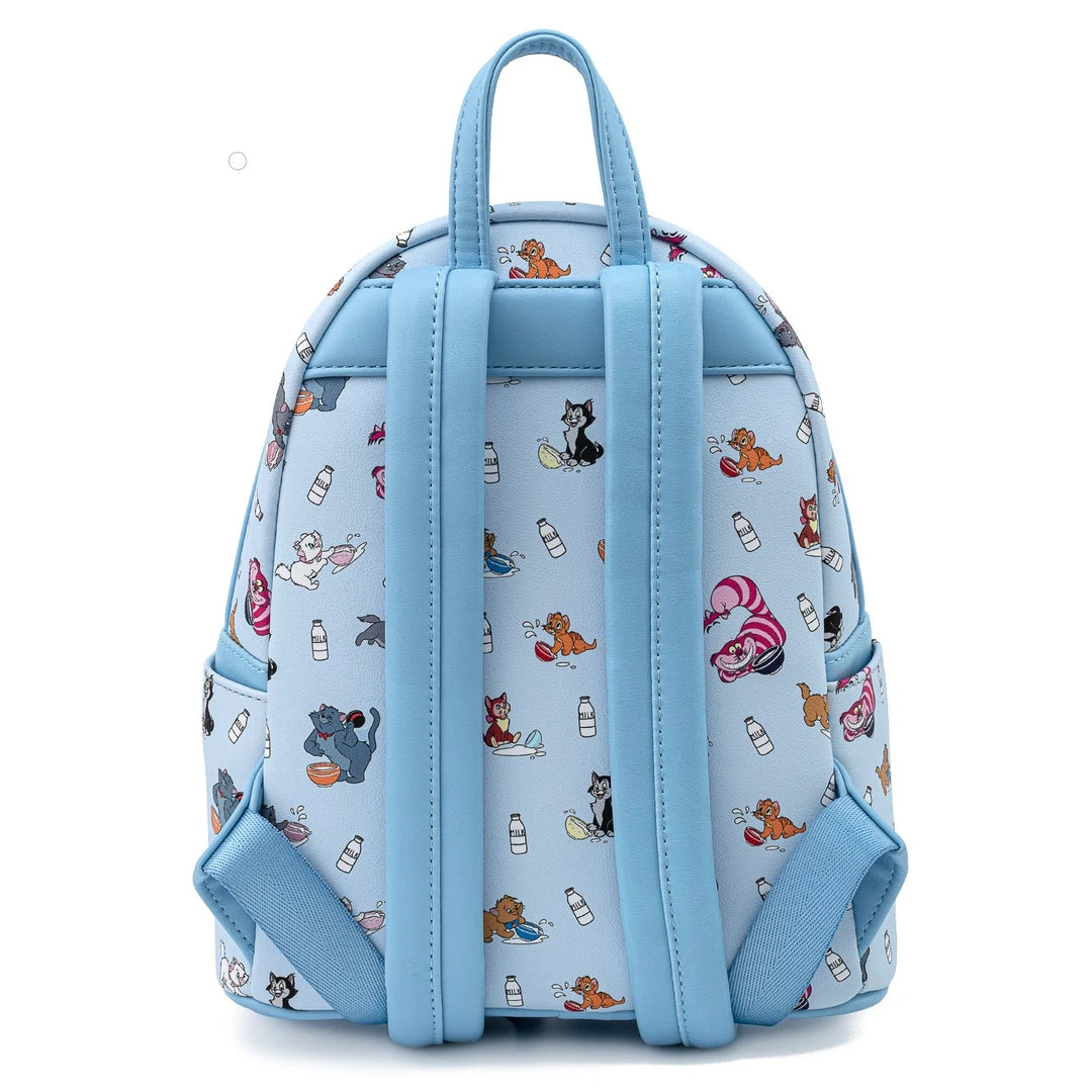 Everybody wants to be a cat—and this Loungefly Modern Pinup Exclusive Disney Cats Mini Backpack has the purrrfect touch of feline charm. Features Cheshire Cat, Oliver, Figaro, Alice’s cat Dinah, triplets Marie, Toulouse, and Berlioz, and Scat Cat doing everything a cat loves to do—drink milk and get into a little mischief along the way. Interior is lined with light blue fabric with white paw print pattern.