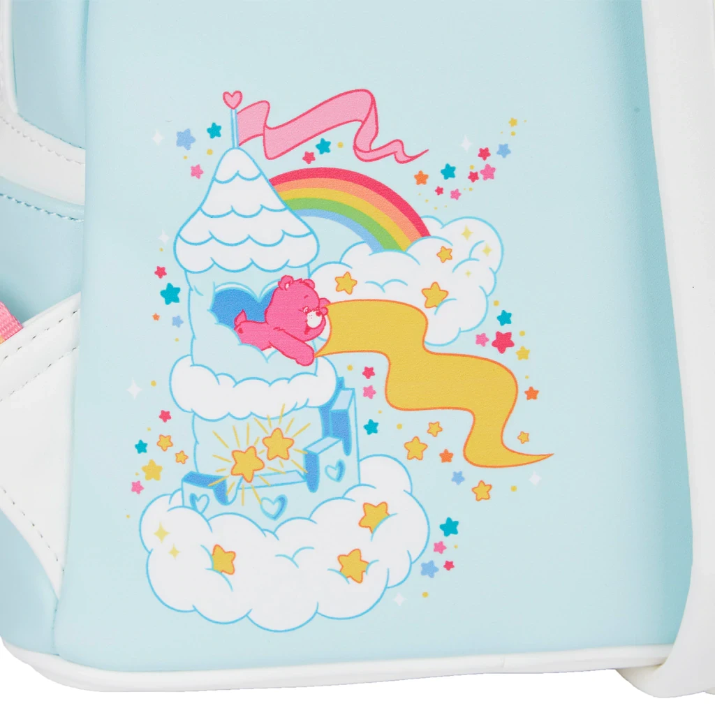 Celebrate the sweetest bearsβ 40th anniversary with the Care Bears Care-a-Lot Castle mini backpack! Up in Care-a-Lot, you can see many old friends playing in the clouds together, including Grumpy Bear, Friend Bear, Share Bear, and Bedtime Bear. Not only is this bag nostalgic for anyone who grew up with these iconic characters, it has many features any Loungefly lover is sure to appreciate!