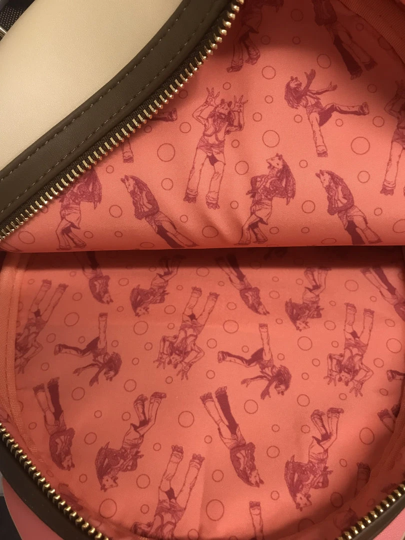 Features: adjustable shoulder straps, side pockets, sturdy metal hardware, enamel zipper charm detail, applique, printed detail and coordinated printed lining