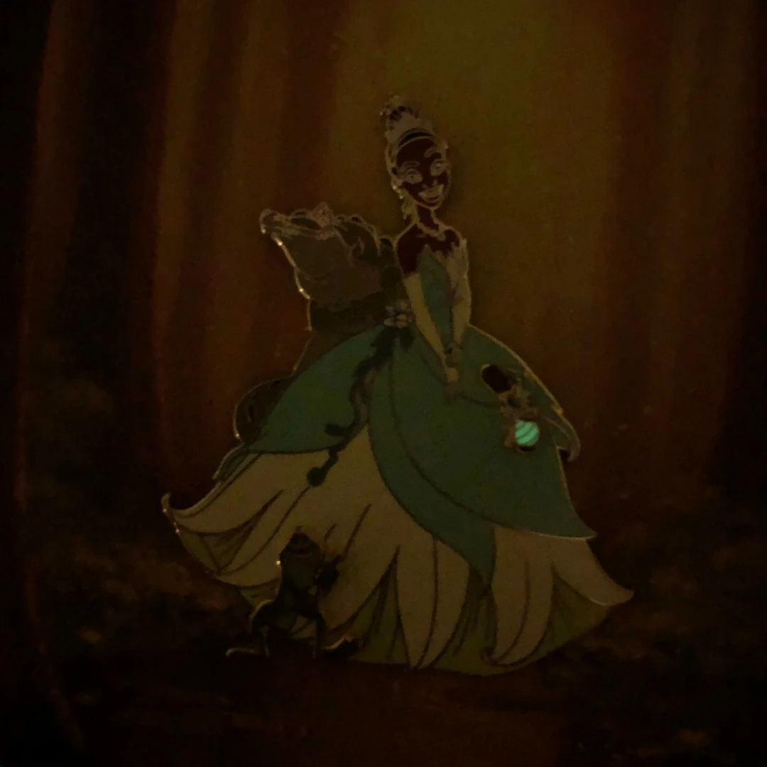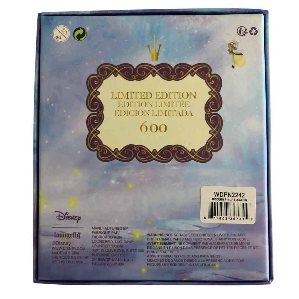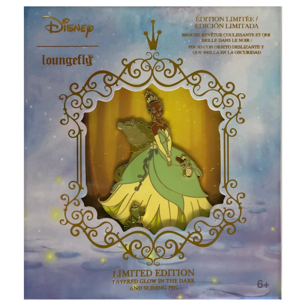 Show off your love for Princess and the Frog with this Modern Pinup Exclusive Loungefly Tiana Limited Edition Pin w/Glow in the Dark Ray that also doubles as a sliding pin! Includes Tiana in her green gown, Prince Naveen frog, Louis the alligator, and Ray the firefly against a bayou background. Comes in beautiful collector’s case with viewing window.