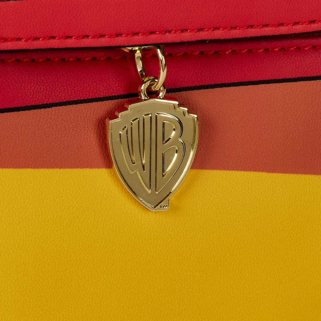 Features: Side pockets, adjustable straps, Warner Brothers enamel zipper charm, applique, and printed details.