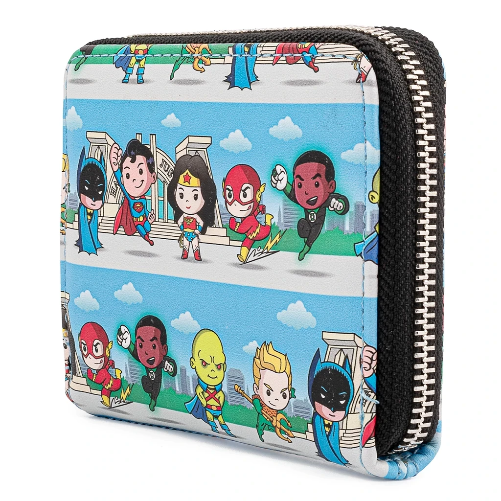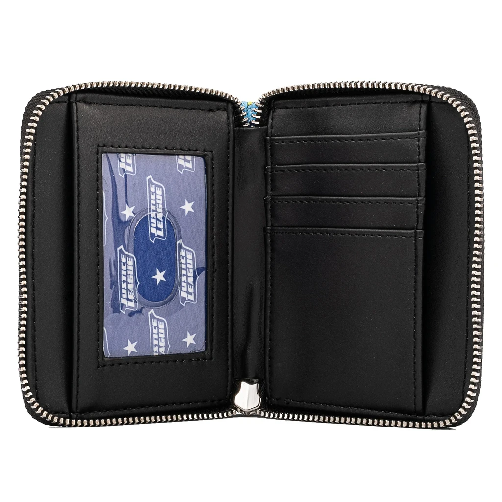 DC vs Marvel: Do we even have to ask? Flaunt your DC pride with this Loungefly DC Comics Superheroes Chibi Wallet, including the famous Justice League superheroes Superman, Batman, Wonder Woman, Flash, Aquaman, Green Lantern, and Martian Manhunter. This compact wallet holds 4 cards, ID, and bills, with dark blue fabric printed with white stars and “Justice League” pattern.
