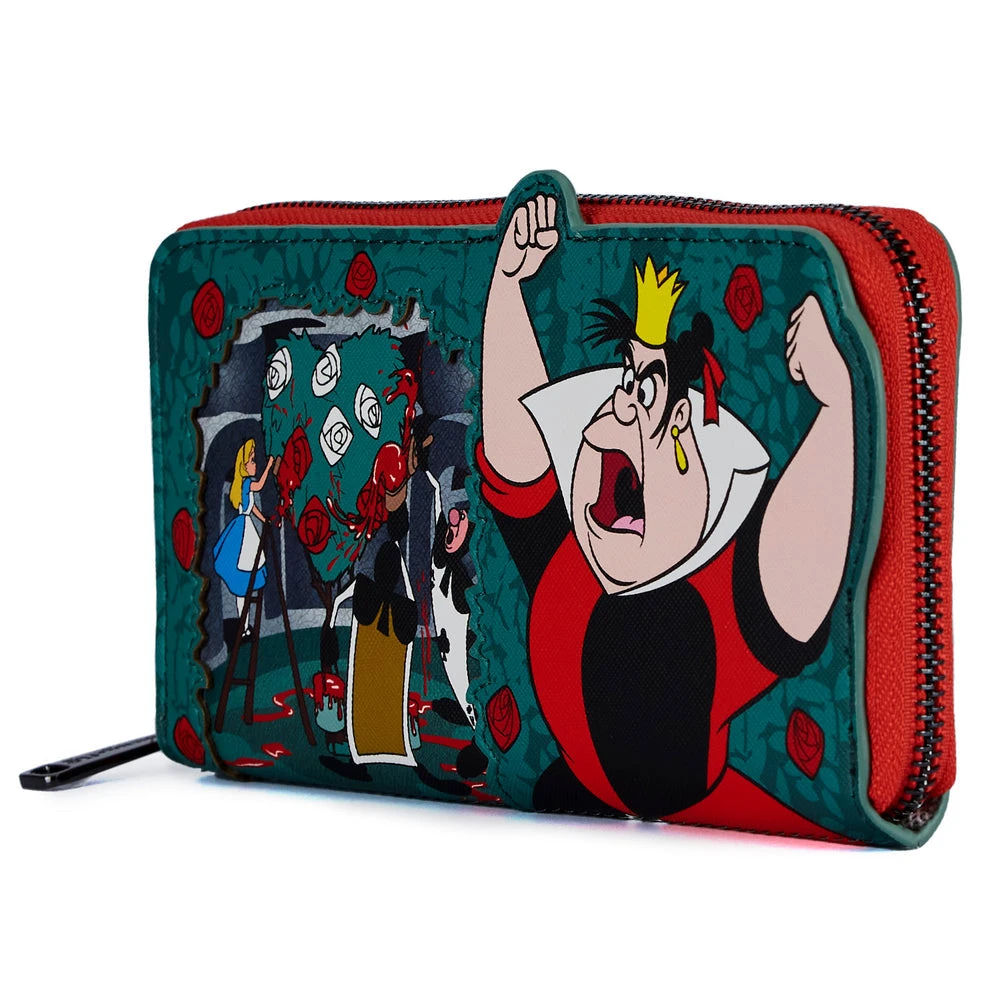 Dare not stop, and don’t waste a drop of opportunity in snagging this wallet! Complete your official Loungefly Queen of Hearts set and or simply perfect your wardrobe with a dangerously wicked addition. Featuring 7 card holders, an ID window, bill fold and zippered coin-pouch! Keep your cards and cash, as well as your head!