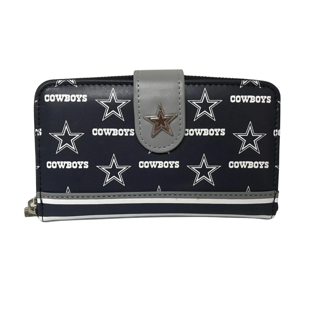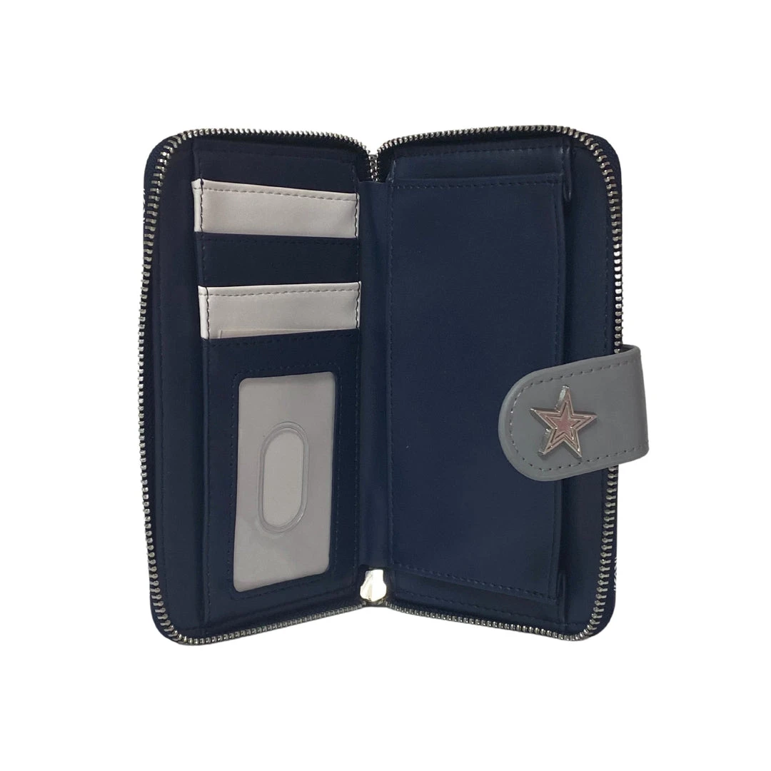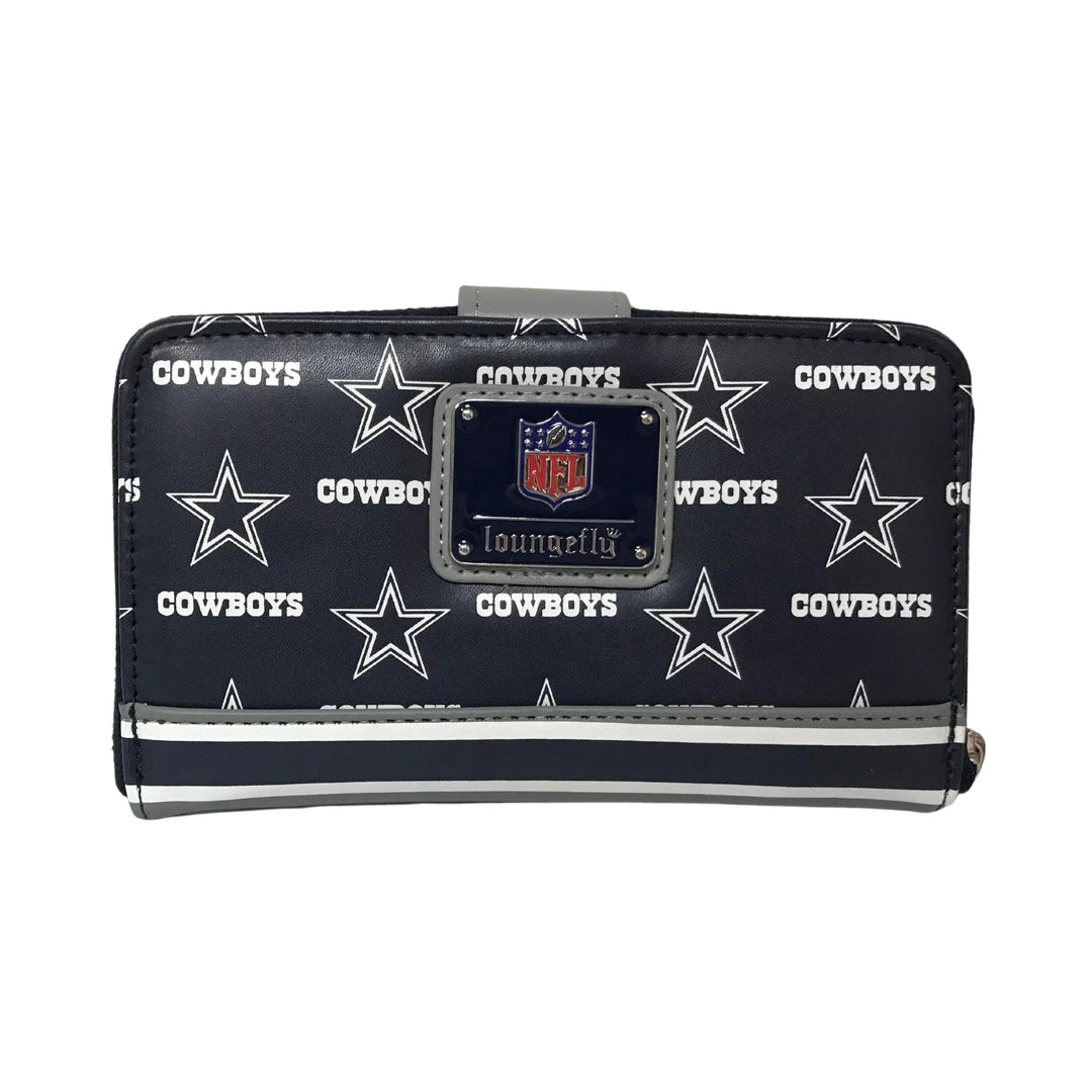 Accessorize with this spirited wallet and score points in functionality and style! Adorned in an awesome AOP logo print, this wallet not only completes the Official NFL Cowboys Loungefly set but also features 3 card slots, ID window, and 2 bill folds!