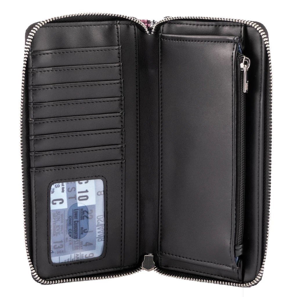 Features: wallet zips closed, has sturdy metal hardware, and features: applique, and printed details, 7 card slots, 1 bill folds, ID window